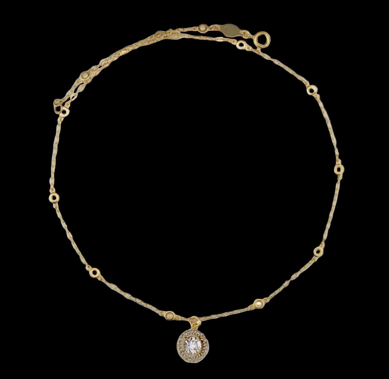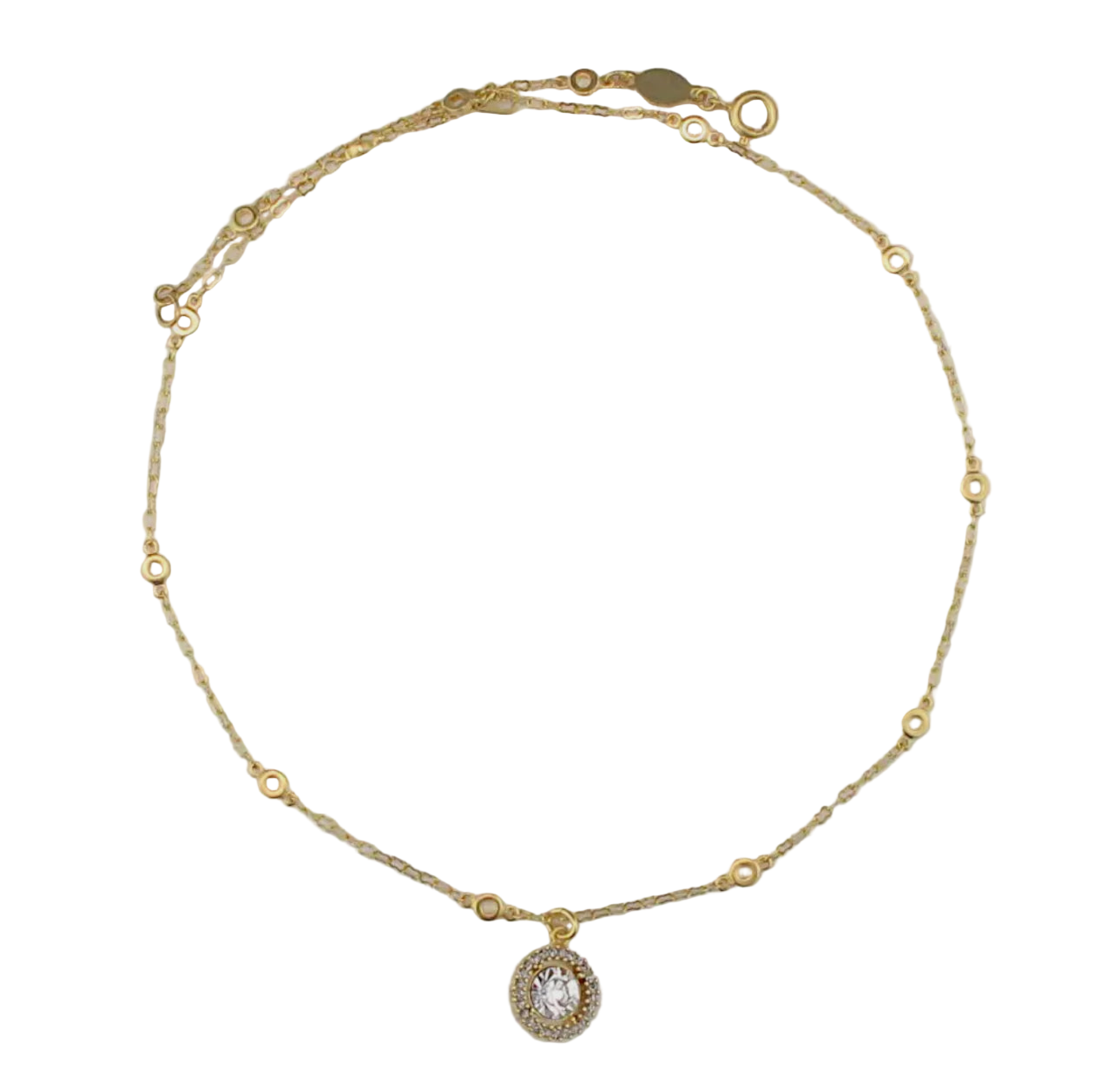 A luminous solitaire crystal surrounded by delicate pavé detailing, set on a refined 14k gold finished chain.